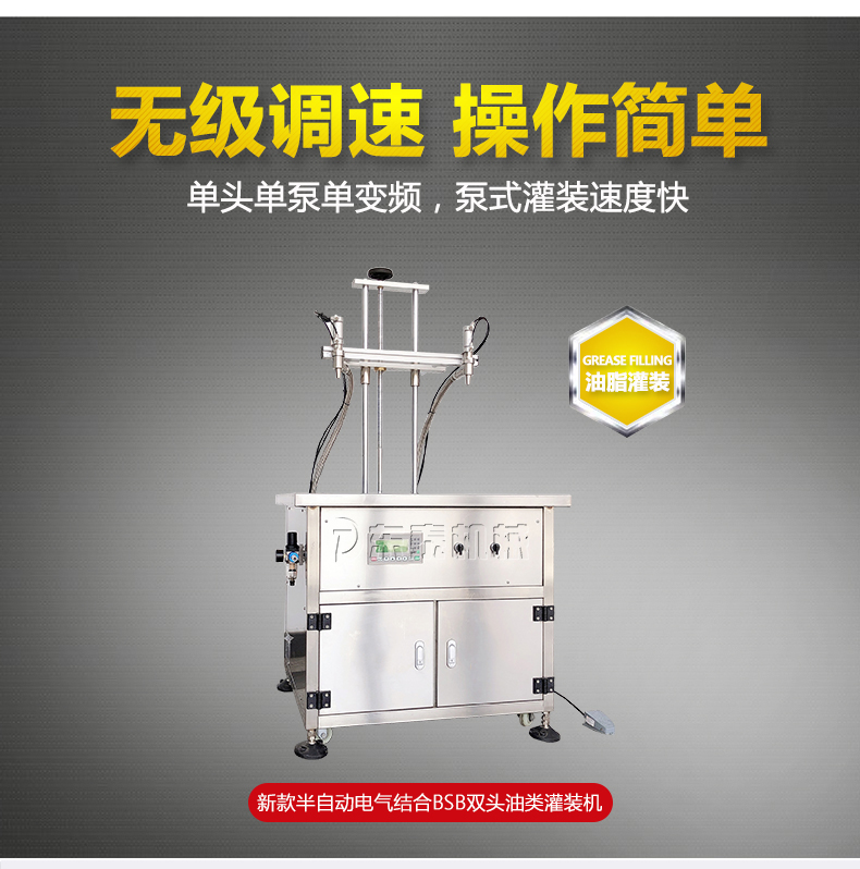 半自動雙頭食用油灌裝機主要是應用于各種食用油、潤滑油等粘稠液體的定量灌裝,如花生油,大豆油,菜籽油、香油,潤滑油等油類的灌裝。還擁有這先進的定量灌裝技術(shù),結(jié)合了微電子智能控制技術(shù)有著單頭單變頻控制系統(tǒng),實現(xiàn)高精度、無級調(diào)速,操作方便。兩個灌裝頭能夠在一定的范圍內(nèi)隨意調(diào)節(jié)間距和灌裝量,能夠使用多種大小形狀的容器的灌裝。自動化程度高。另外,半自動雙頭食用油灌裝機的機身零件選用的事優(yōu)質(zhì)不銹鋼,耐用又衛(wèi)生,長時間工作性能可靠穩(wěn)定。本公司產(chǎn)品通過了IS9000質(zhì)量體系認證。設(shè)備經(jīng)久耐用,性能穩(wěn)定,是食用油、潤滑油等行業(yè)理想的灌裝設(shè)備。